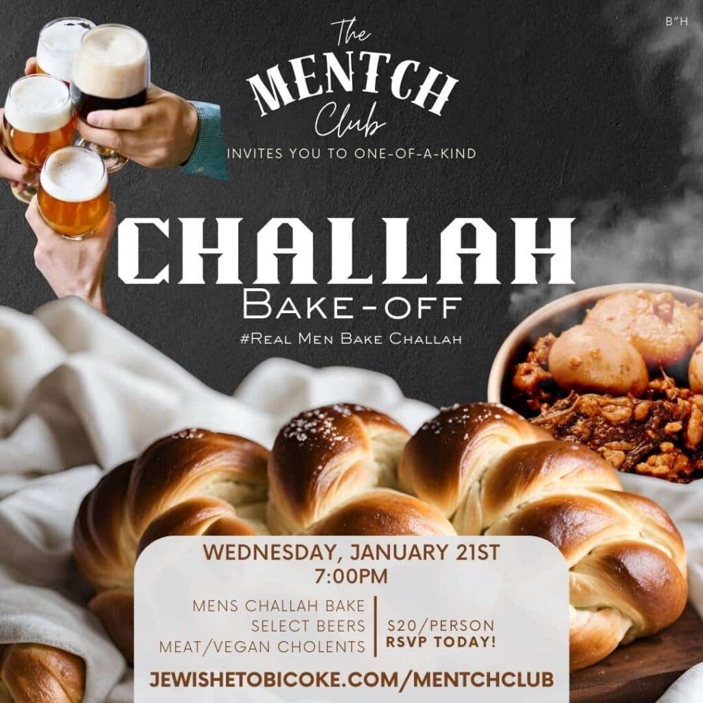 The Mentch Club: Challah Bake-Off The Mentch Club: Challah Bake-Off – Join us Wednesday, Jan 21 at 7 PM for a men’s challah bake, select beers, and delicious meat & vegan cholents. #RealMenBakeChallah Name(Required) First Last Email(Required) PhoneHow many people attending(Required)12345Share the Joy with others in the Community Yes, I'd like to donate. Donation Amount $54.00 CAD $180.00 CAD $360.00 CAD $1,800.00 CAD Custom Donation Custom Donation Amount Payment Method(Required) Credit Card Other (Cash or Check, pay at the event) Total Credit CardCard Details Cardholder Name Δ